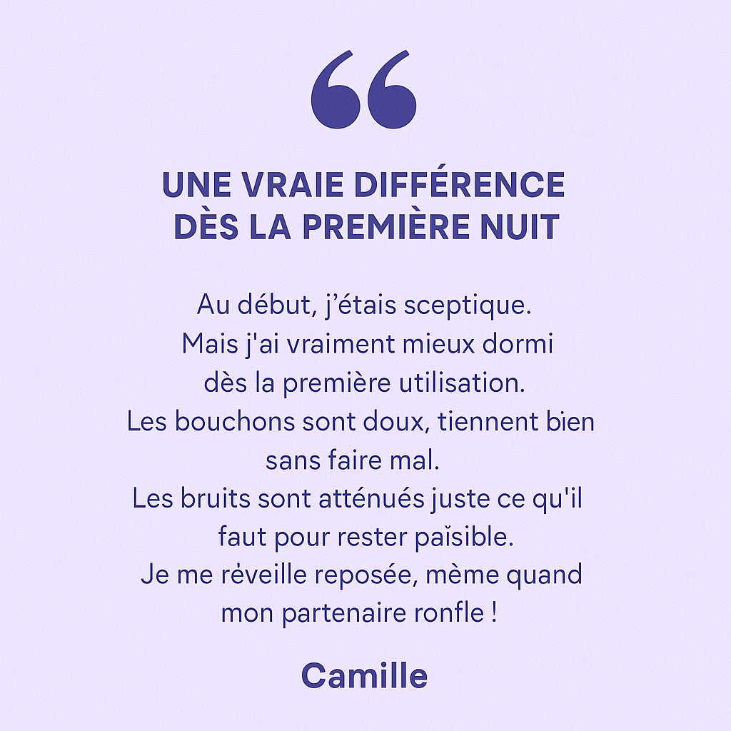 June 2025ÉÉmilie T.Acheteur vérifiéIdéal pour le sommeil légerJe me réveillais au moindre bruit. Avec ces bouchons, je me sens apaisée mais pas coupée du monde.